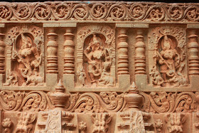 This east facing temple has 3 entrances; east, south and north. 64 lathe turned & polished pillars with rich designs hold up the temple's roof. No two pillars are same in decoration ...which is a norm of ancient temple builders.